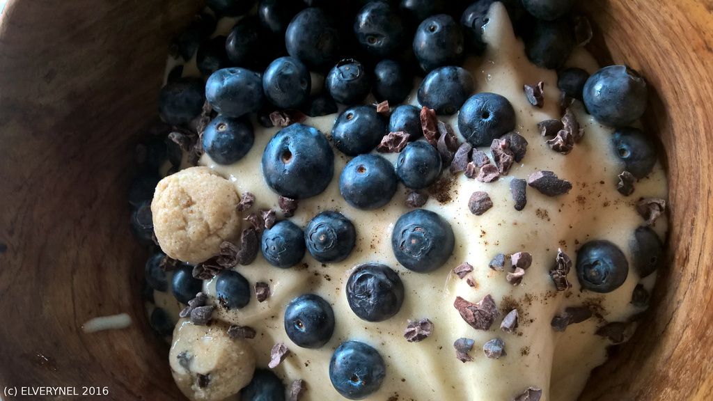 Vanilla (banana-)icecream with blueberries, cocoanibs and